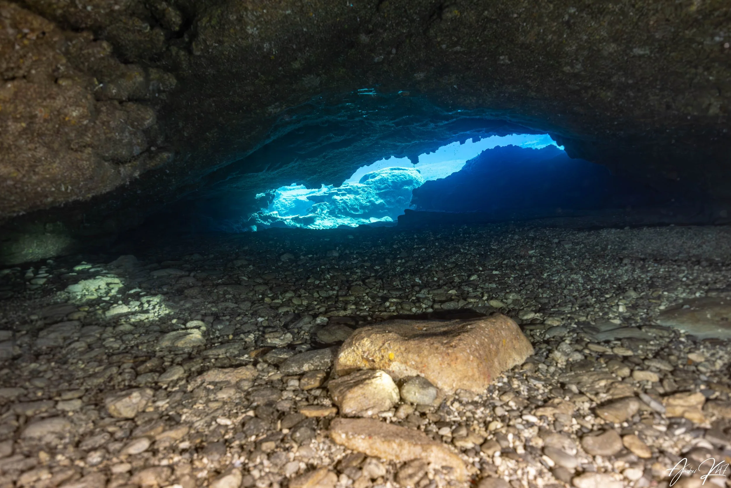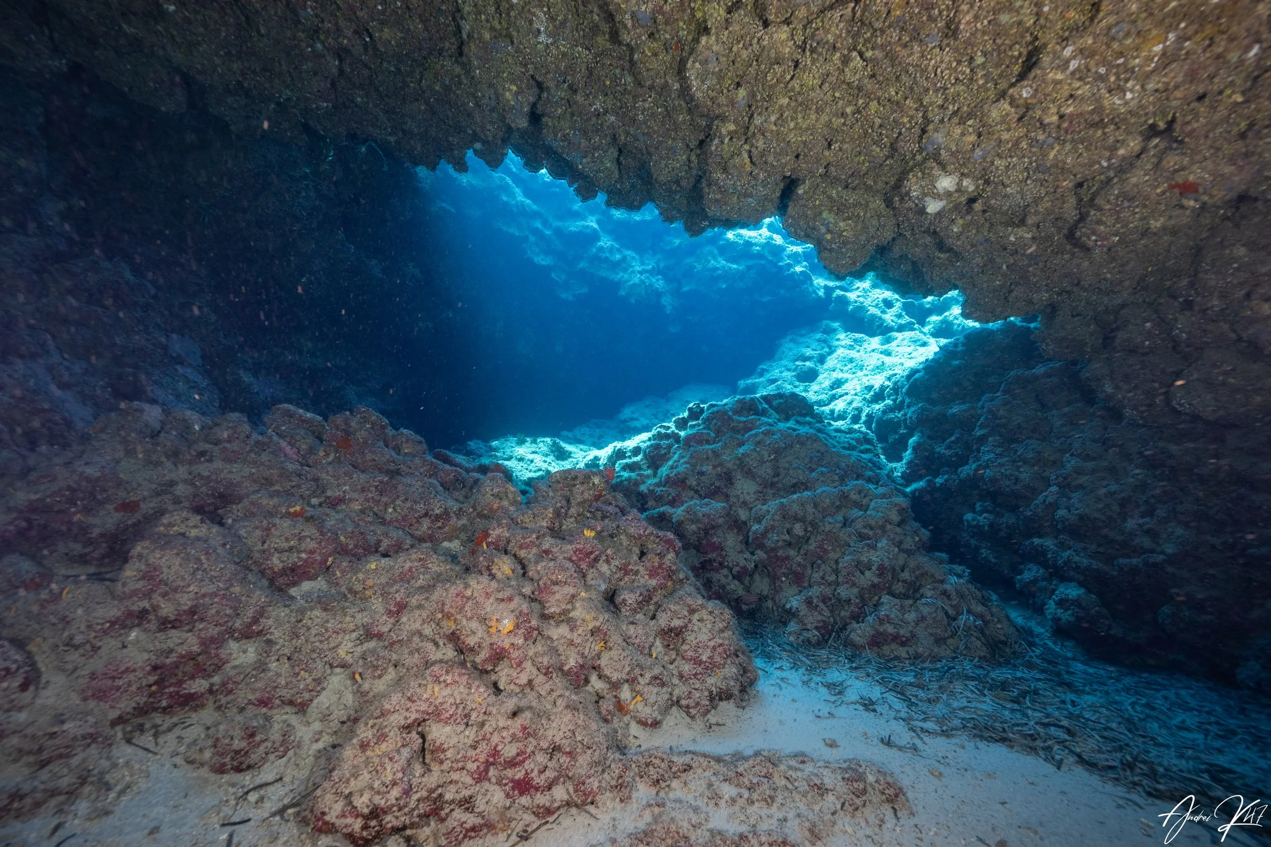 This site may not compare to Mexico’s cenotes, but it offers a surprising amount of exploration for a shallow dive. With a maximum depth of around 12 meters, you can weave through small caves, overhangs, and natural swim‑throughs carved into the coastline. Inside the sheltered spaces, lionfish and sweepers gather in the shadows, creating great opportunities for observation. Seahorses are occasionally spotted along the sandy patches and rocky edges, making them a highlight for many divers.
